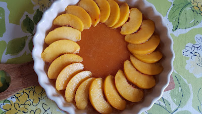 2. Нарязваме прасковите на тънки филийки и покриваме с тях карамела. Може да добавите за красота малко сушени плодове или друг цвят плод - като например синя слива. За допълнителна украса прибавих и малко сушени боровинки.